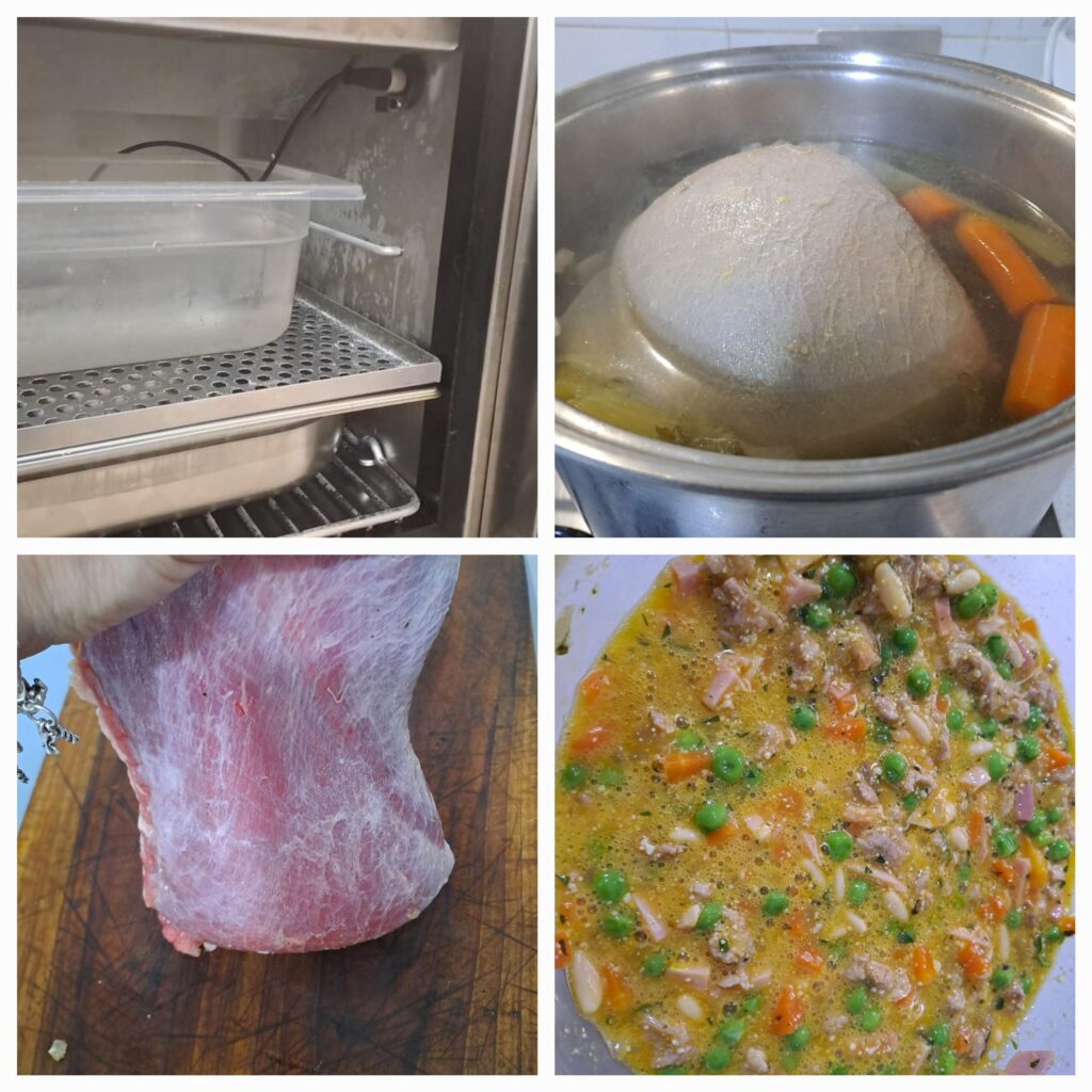 Spegnete il fuoco, preraffreddate l’abbattitore e quando è a temperatura mettete la cima scolata in un contenitore e sopra ponete un peso. Deve essere schiacciata.