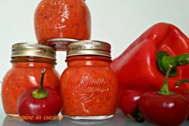 Questa ricetta l’ho trovata sul blog Zucchero e Limone, dove consigliano di farla con peperoni di un solo colore,a me piace come effetto cromatico cosi. Altre ricette frullano il tutto, ma amo i peperoni e mi piacciono interi
