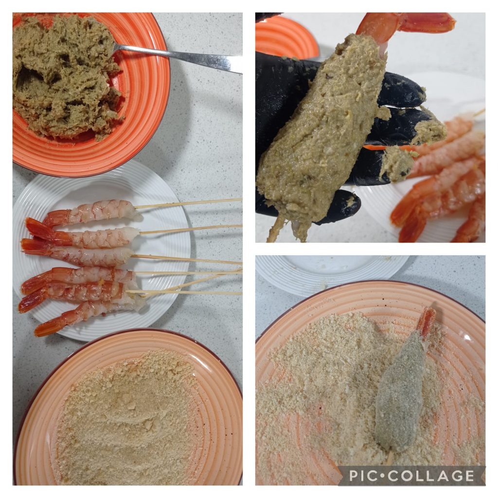 Inumiditevi la mano e mettete un po’ di composto di carciofi, poggiate sopra il gambero e fate aderire bene il composto ( non deve essere troppo).