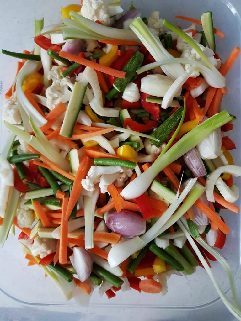 - Tagliate tutte le verdure con le stesse misure, se volete fate come me, altrimenti mettete tutto in un contenitore e mescolate bene.